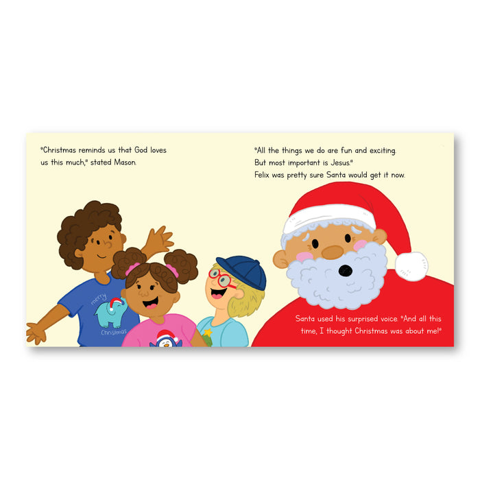 What a surprise. Santa is brought into what the Christmas is about by three cousins who enjoy visiting him. He thought it was all about him; the cousins have a different perspective.